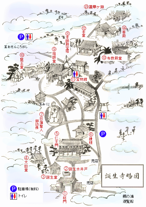 山内ご案内 guide TOP 山内ご案内 誕生寺略図 1.総門 2.誕生水井戸 3.誕生堂 4.太田堂 5.仁王門 6.鐘楼 7.日蓮聖人御幼像 8.本師殿宝塔 9.祖師堂 10.龍王堂 11.宝物館 12.本堂 13.布教殿堂 14.客殿 15.蓮華ヶ淵