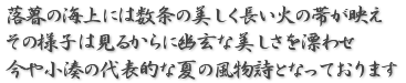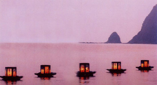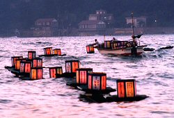 鯛の浦の遊覧船2艘に山積みにされた灯篭は、船尾よりローソクに火を灯した後、海上につぎつぎに流されます。合間に花火が打ち上げられ、それが海面に映えて限りなく美しい流灯供養の情景を点滅します。