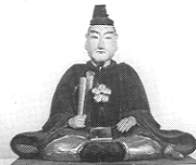 神像は、顎髭をたくわえた老人の相貎で、冠をいただき、束帯を着して右手に笏をとり、太刀を帯します。袍の胸には、太田氏の家紋である五弁の桔梗紋(ききょう)を付けています。