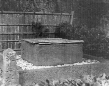 総門を入ると参道の左側には低い生け垣があり、きれいに整備されています。その生け垣に囲まれた一角に、大きな四角い石がおかれているように見えます。日蓮聖人がお生まれになったとき、産湯に使ったと伝えられる誕生寺の井戸です。左手前には、正面に「誕生水」、右側に「うふ水」と刻まれた高さ一メートル程の石柱が標識に立てられていますから、足を止めた方もいらっしゃるでしょう。