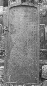 碑は項部に緩く円みを付けた一枚石で、高さ約2メートル、幅80cm、厚さ30cm程、わずかに末広がりですが、背面は鑿で切り出したままです。碑面は枠を取ったように周囲から掘り下げてあり、碑文が刻まれています。「茲山是菩薩之生処(この山はこれ菩薩の生処)」と始まる文章は10行にわたっていますが、残念なことに碑面の風化が著しく、特に左半分はほとんど文字を判読することが出来ません。最末の行は辛うじて「元禄壬午十五年・・・・・誕生山寺・・・・・大中・・・・・」と読めますから、この碑が元禄15年(1702)に建立されたことがわかります。この年は、大中院日孝上人が26世貫首の在住中ですから、文中の「大中」は日孝上人に違いありません。碑文は日孝上人の撰であったのです。
