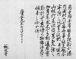 誕生寺の寺領安堵の朱印状は、三代将軍家光のものが最初です。第十九世貫首日遵上人は、正保4年(1647)6月、寺社奉行所に寺領安堵の朱印状を下されるよう願い出、翌慶安元年7月17日付の朱印状が下されたのです。この朱印状は、慶安元年2月24日から翌2年10月24日にかけての日付で五十石以下と遠国の寺社に対する新規の寺領を認めた朱印状3152通の内の表でしたから、日遵上人の活動が功を奏したといえましょう。朱印状は、檀紙(だんし)と呼ばれる大型で皺がある厚手の紙に「当寺領、安房国長狭郡小湊内浦村の内七拾石の事、先規にまかせてこれを寄附せしめおわんぬ。全く収納すべし。並びに境内山林竹木諸役等これを免除す。有来ごとく永く相違あるべからず。てえれば、長日の勤行怠慢なく、仏法興隆の悃志(こんし)を抽(ぬきん)ずるべきの状、件(くだん)のごとし」と記され、宛先は「誕生寺」、将軍家光の大型朱印が日付の下に捺してありました。