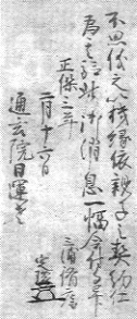 誕生寺に伝わる日蓮聖人御真蹟断簡には、為春の裏書が記されているものがあります。正保3年(1646)2月16日付で「不思儀(議)の機縁を以て親子の契約を仕るに依って、その験として此の御消息一幅を付与せしめ畢」とあり、宛名は「通玄院日運老」と記されていました。これは誕生寺二十一世通玄院日運上人(1604~1663)のことです。為春は、日運上人と親子の関係を結んでいたのです。