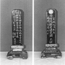 大型位牌の一つに、徳川の家紋である三つ葉葵の紋が入ったものがあります。「安祥院殿受徳光潤大姉」とあり、高さ33.5センチメートル余り、命日は「寛政元己酉年(1789)四月上浣(上旬)六日」と記されています。位牌の裏側に記された銘文には、当山四十二世日沾上人の代である寛政元年8月に、清水宰相重好卿の御母堂の永代回向料として金百両が寄進されたとありますから、安祥院殿は徳川家御三卿の一つである清水家初代重好の母であったのです。